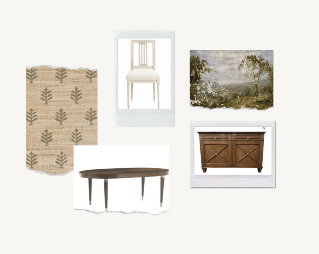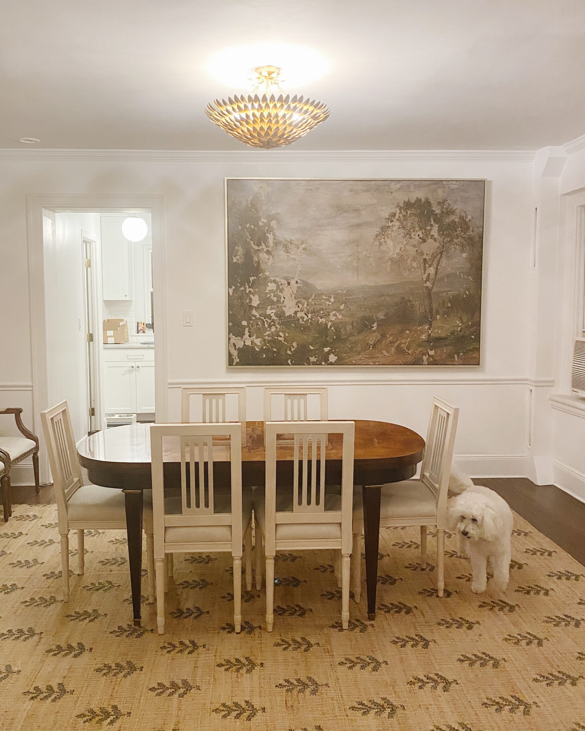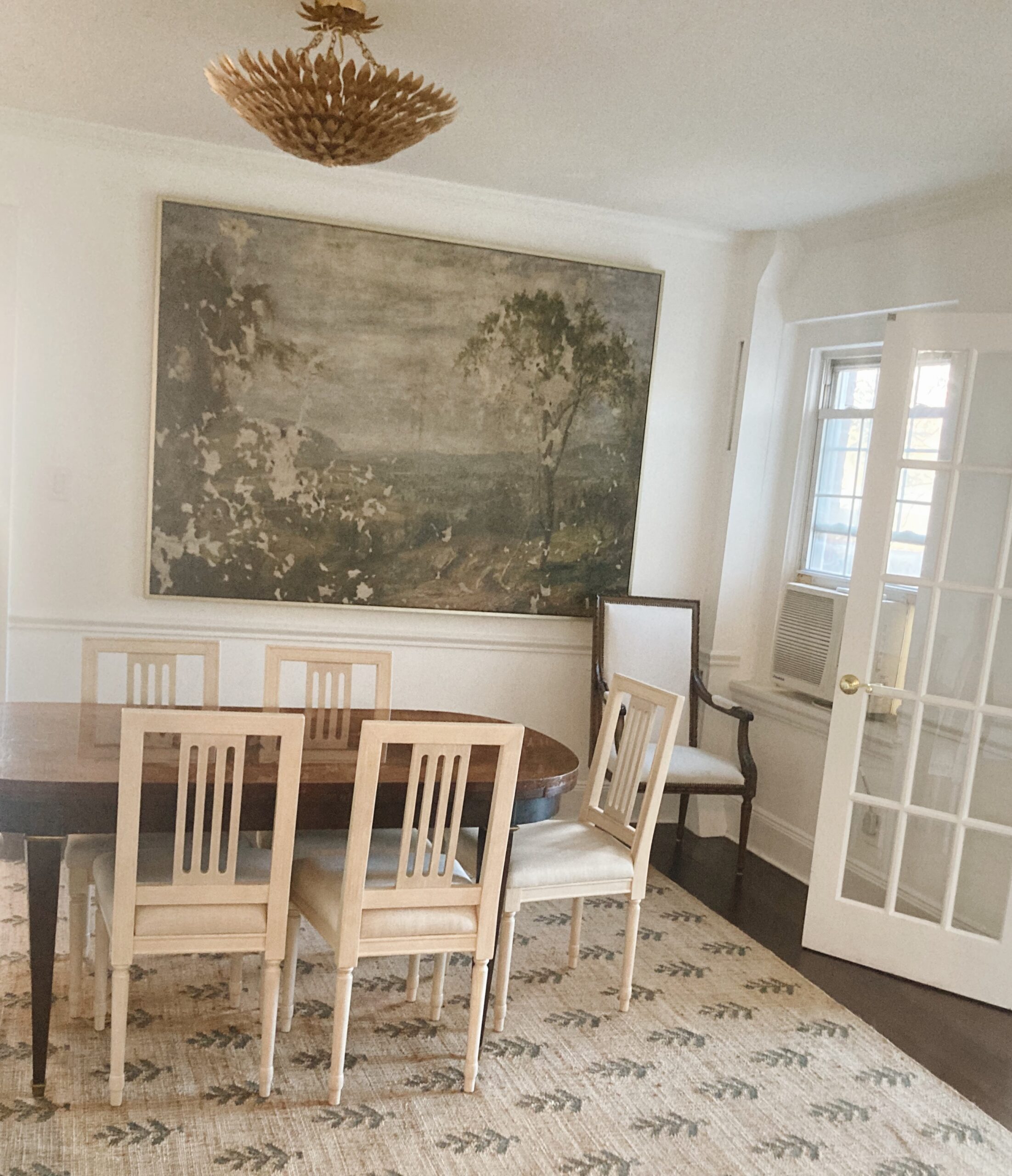 As you’ll see from our dining room before and after pictures, we took a room that was covered in wall to wall carpet, yellow paint and some unfortunate window treatments and completely transformed it. We restored and refinished the hardwood floors underneath the carpet, replaced the lighting, painted it, and removed the unfortunate window treatments and built-in wooden scalloped valance. Just that alone made it feel like a new space, and then when it came to decorating, I was really feeling dark woods and greens. We found an antique dining room table on Facebook Marketplace that I fell in love with and that became the focal point of the room, but it took me a long time to figure out how to decorate with it in a way that didn’t feel too crusty. I initially thought I wanted wallpaper and upholstered French Louis dining chairs, but I ended up going for something less feminine that didn’t feel quite so quintessential grandmillenial. I found this gorgeous oversized mural for the walls that served as my wallpaper in a sense, and that helped shape the rest of the room, from the rug we chose to the chairs. We had planned to recover the chairs, but since we’re moving, we decided to keep them neutral for now and I actually think they work. I think we could have probably done a stronger light, but I bought this Aerin knockoff when the room was down to its studs and my contractor insisted he needed something to hang that week (spoiler alert: it sat in the box for weeks, no, months). I loved it, but I didn’t design it holistically with the whole room in mind and probably would have chosen something else if we were staying.